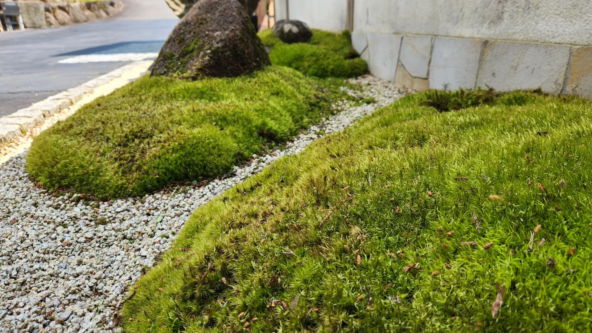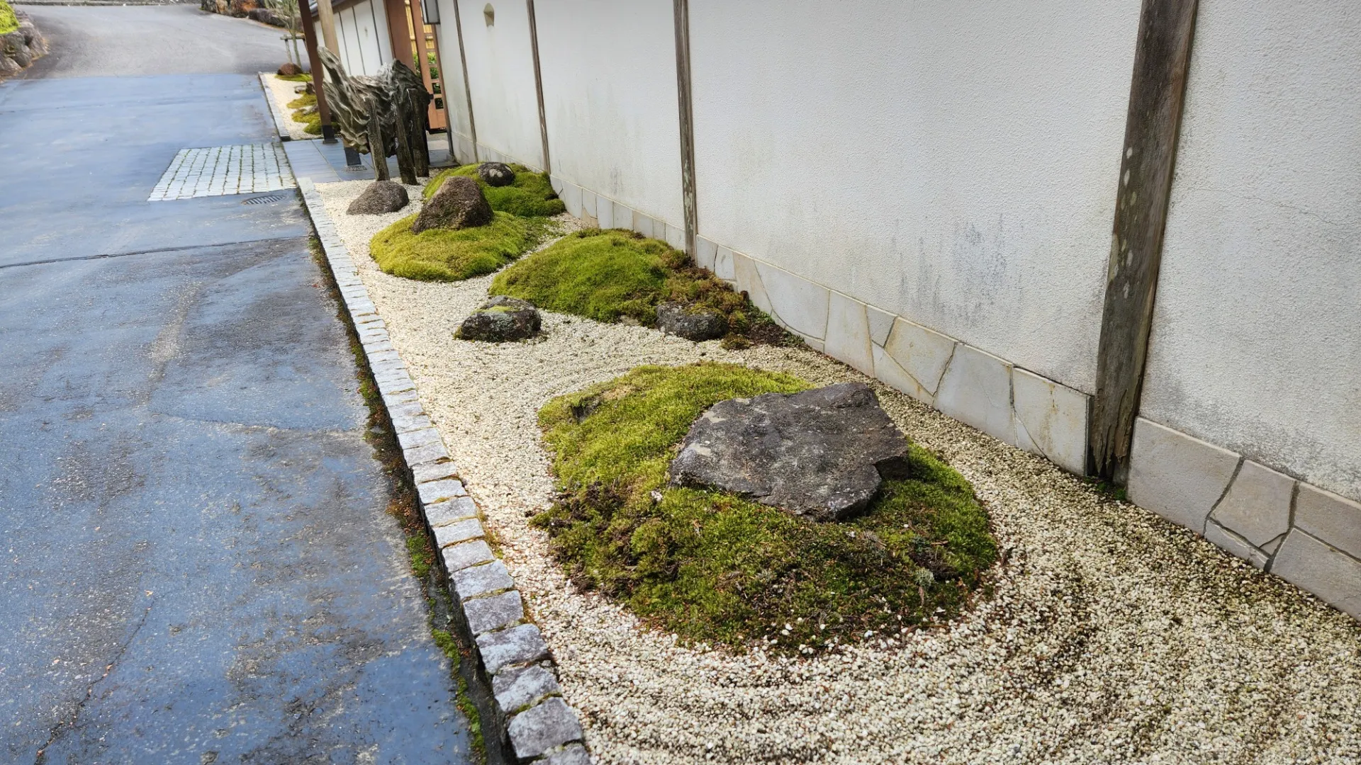 築山の苔と白い玉シャリ、施設内から採取した岩とのハーモニーがとても綺麗です。