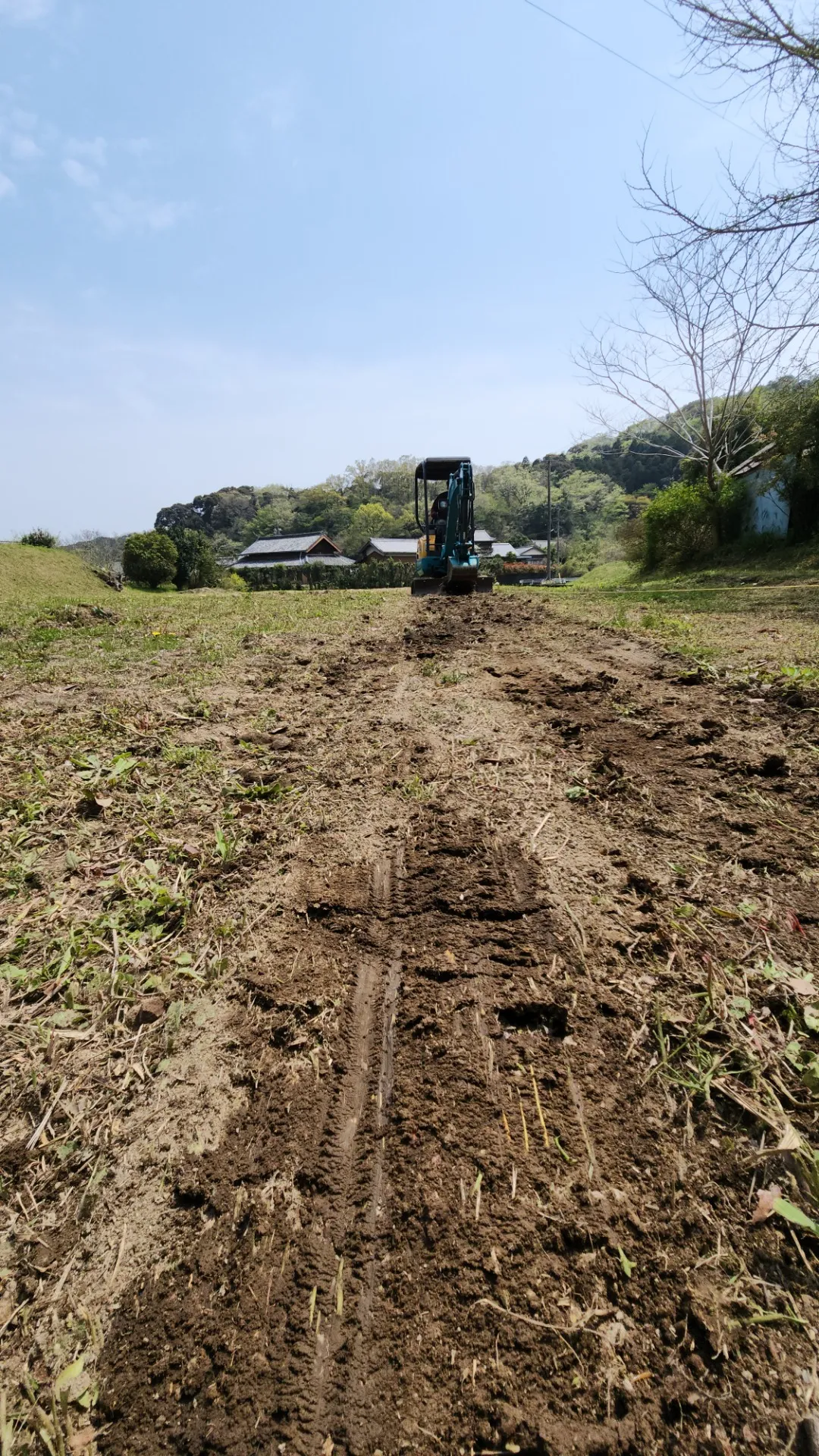 ユンボを使って丁寧に慣らしていきます。慣らし終えたらユンボで敷地内を何往復もして踏み固めました。