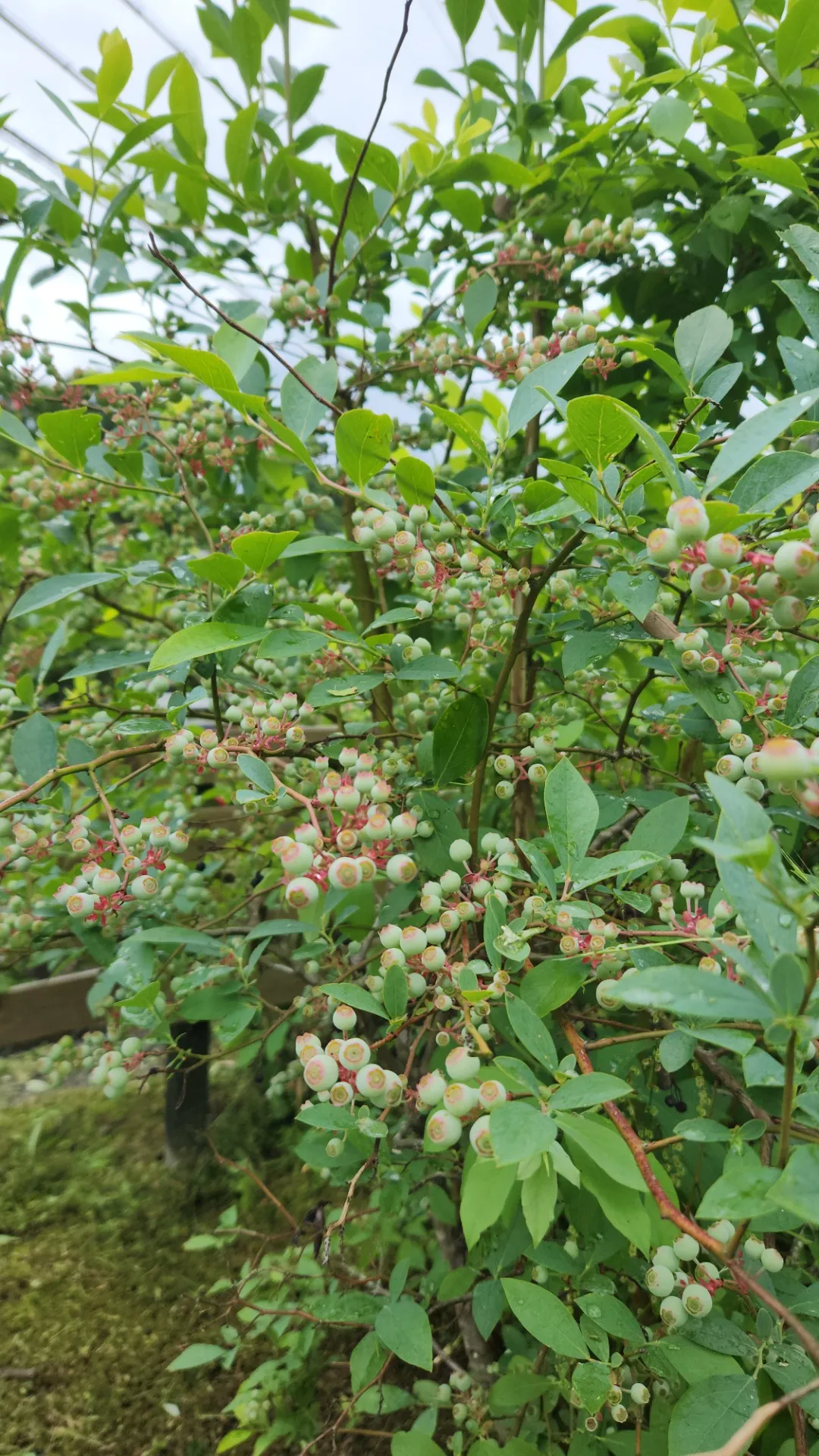 苔の圃場の脇に植わってるブルーベリーにぎっしり実がついて肥大してきました。