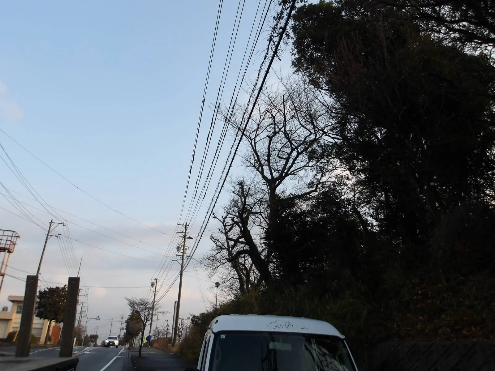 道路側にかなり長く伸びている枝が下を通る大型トラックや