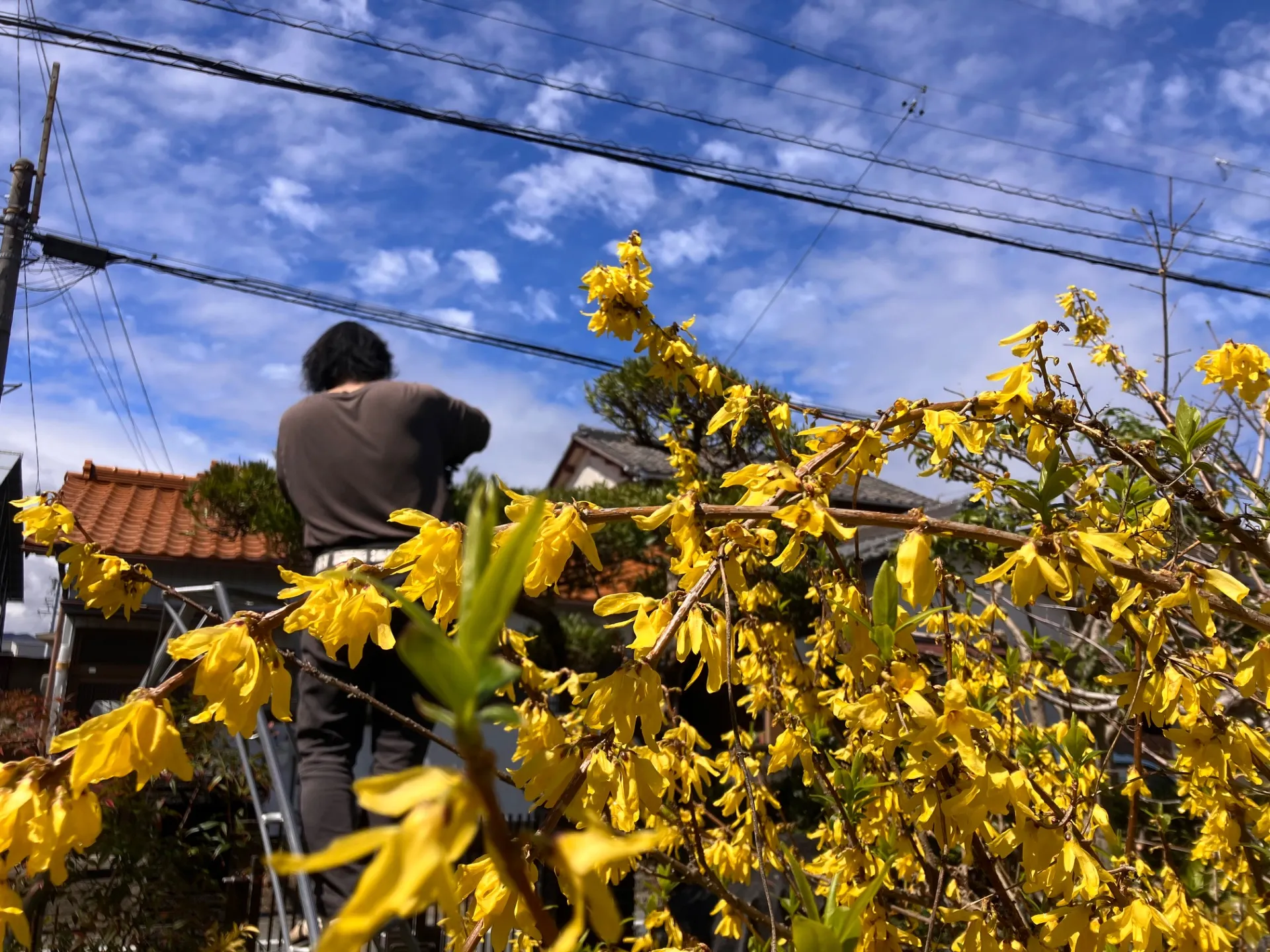 お客様の**レンギョウ(連翹)**が、まるで春の光をぎゅっと集めたように満開でごさいました…。